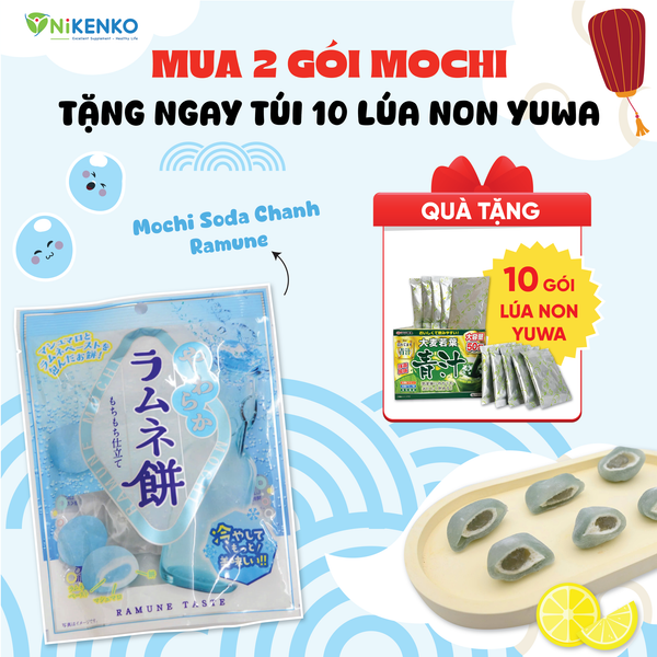 Bánh Mochi Soda Chanh Ramune 115g – Món ăn nhanh nhập khẩu trực tiếp từ Nhật Bản, nổi bật với hương soda chanh ramune độcg, chua nhẹ, thanh mát và thơm ngọt tự nhiên.